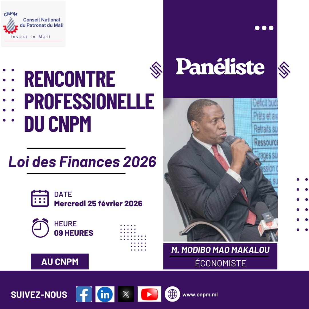 Le Conseil National du Patronat du Mali (CNPM) organise sa Rencontre Professionnelle consacrée à la Loi de finances 2026 .