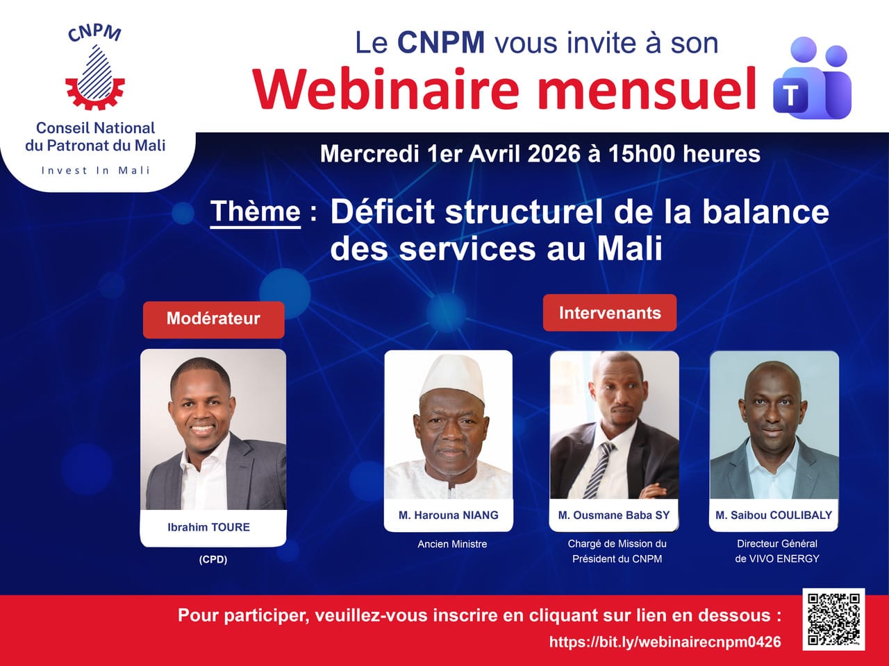 Le Conseil National du Patronat du Mali (CNPM) vous invite à participer à un webinaire de haut niveau consacré à l’analyse du déficit structurel de la balance des services au Mali.