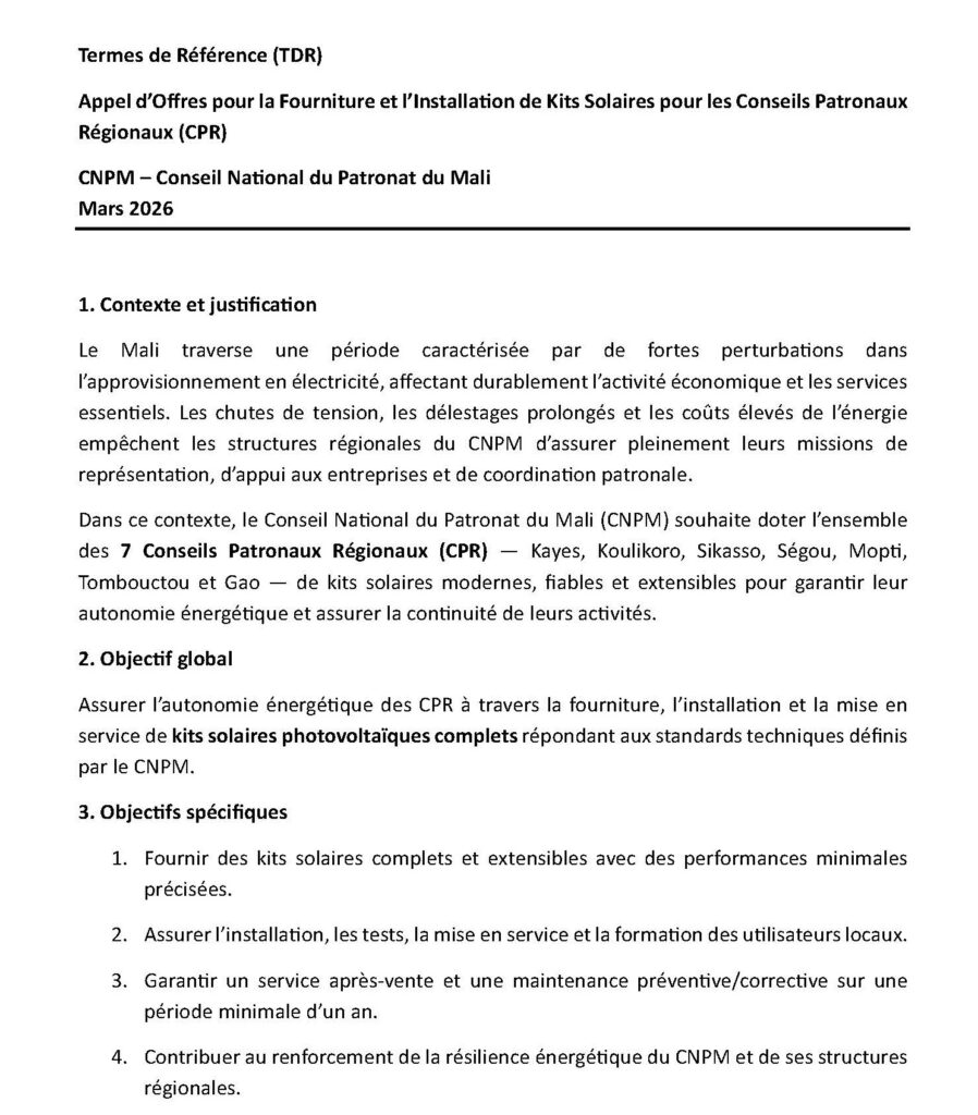 Le Conseil National du Patronat du Mali (CNPM) informe les entreprises intéressées du lancement d’un appel d’offres relatif à la fourniture et à l’installation de kits solaires photovoltaïques au profit des Conseils Patronaux Régionaux (CPR). Les entreprises intéressées sont invitées à consulter les Termes de Référence (TDR) ci-joints pour prendre connaissance des spécifications techniques, des conditions de participation et des modalités de soumission. Pour toute information complémentaire, prière d’envoyer un mail à osy@cnpm.ml 📅 Date limite de soumission : 31 mars 2026 à 16h00 Ci-joint : les termes de référence