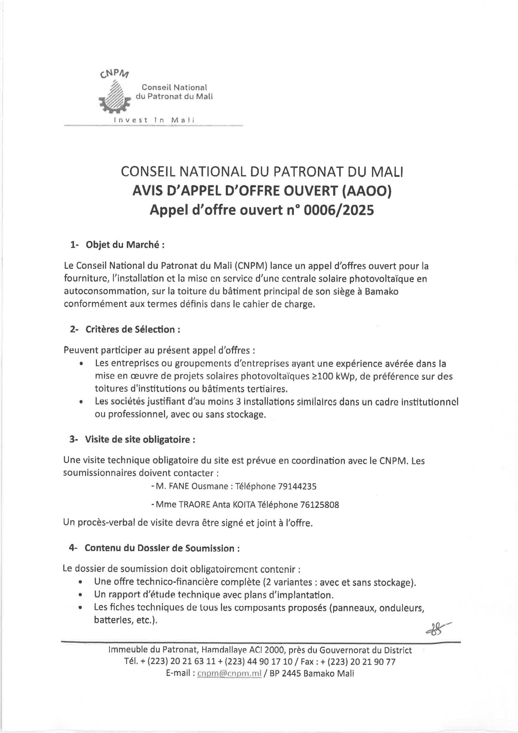 Le Conseil National du Patronat du Mali (CNPM) lance un appel d’offres ouvert pour la fourniture, l’installation et la mise en service d’une centrale solaire photovoltaïque en autoconsommation, sur la toiture du bâtiment principal de son siège à Bamako conformément aux termes définis dans le cahier de charge.