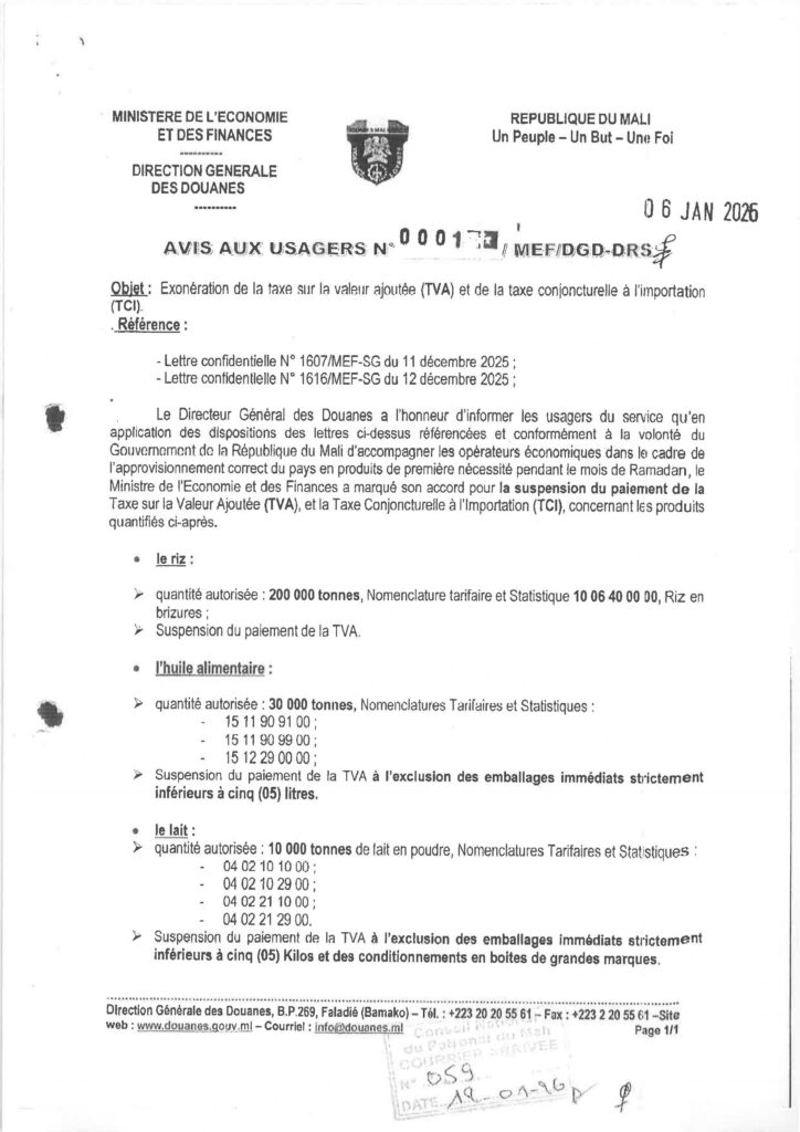 Avis aux Usages de la Direction Générale des Douanes sur l’Exonération de la taxe sur la valeur ajoutée (TVA) et de la taxe conjoncturelle à l’importation (TCI)